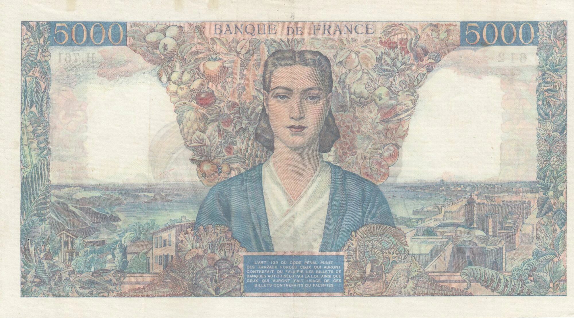 Ce billet de banque a été émis par la France et présente une valeur nominale de 5000 francs.