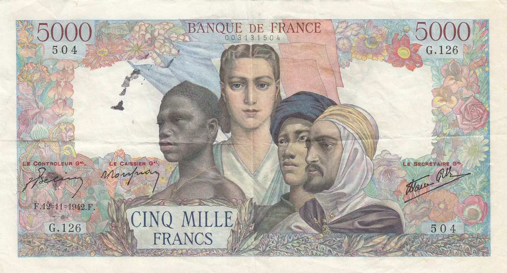 Banknote France 5000 Francs France and colonies - 12-11-1942 Serial G.126 - VF