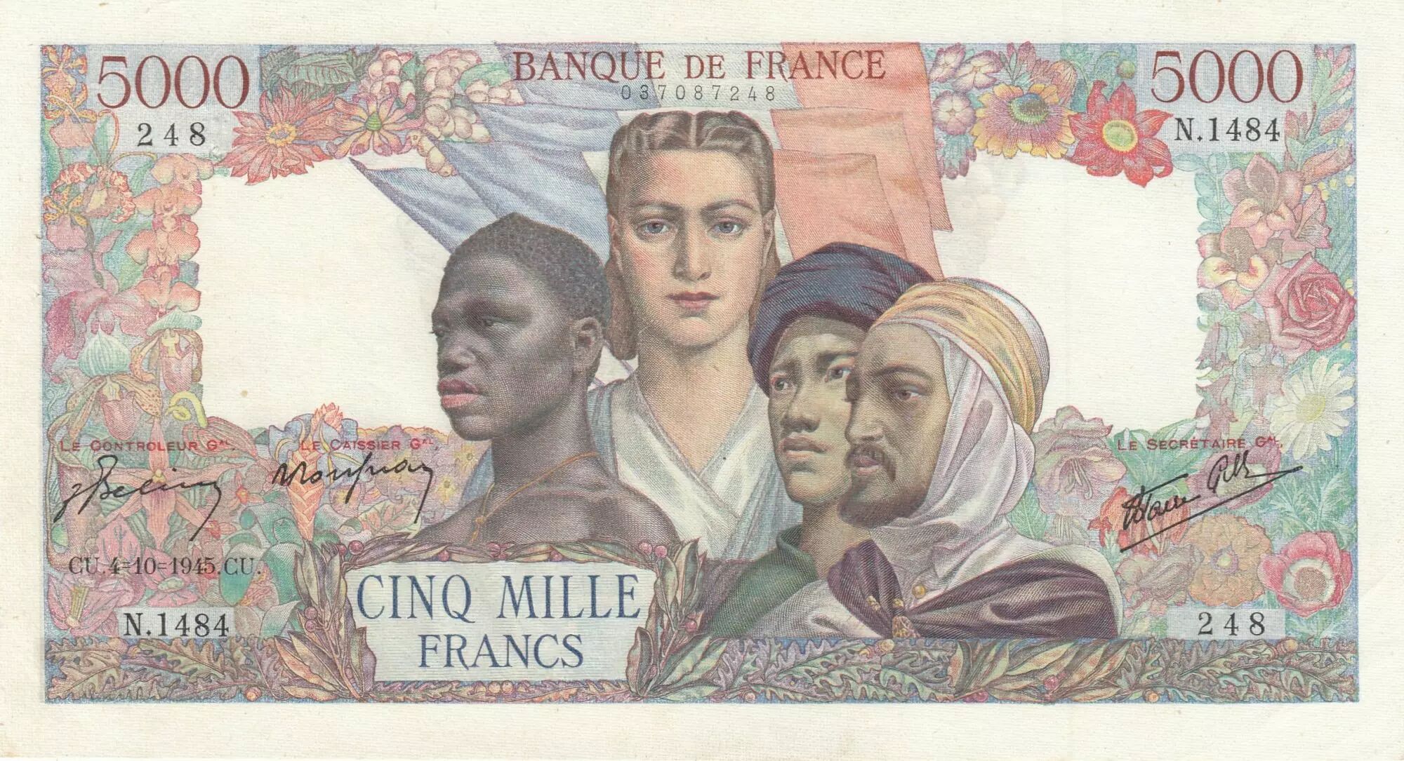 This banknote is an issue from France, with a face value of 5000 francs. It was issued on October 4, 1945, and is part of series N.1484.