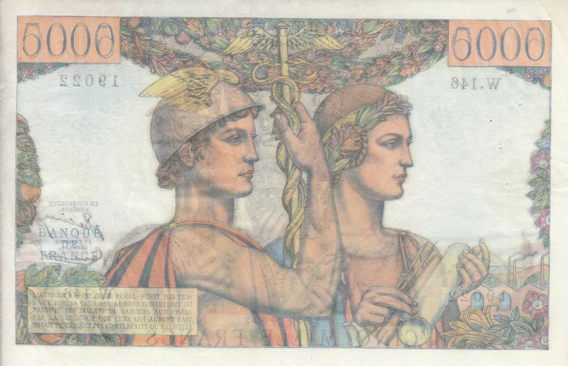 This 5000 Francs banknote is a historical testament to France in the 1950s, both in terms of its economic value and the symbols it conveys. It represents a collectible item prized for its rarity and historical value.