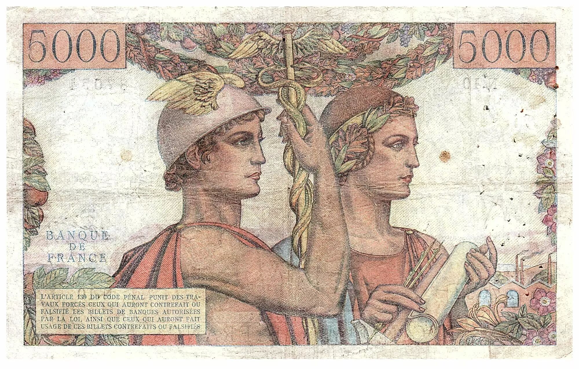 Home > French Banknotes > Bank of France Banknotes > 5000 Francs Banknotes > France 5000 Francs Sea and Countryside - 10-03-1949 - Serial N.10 - F.48.01