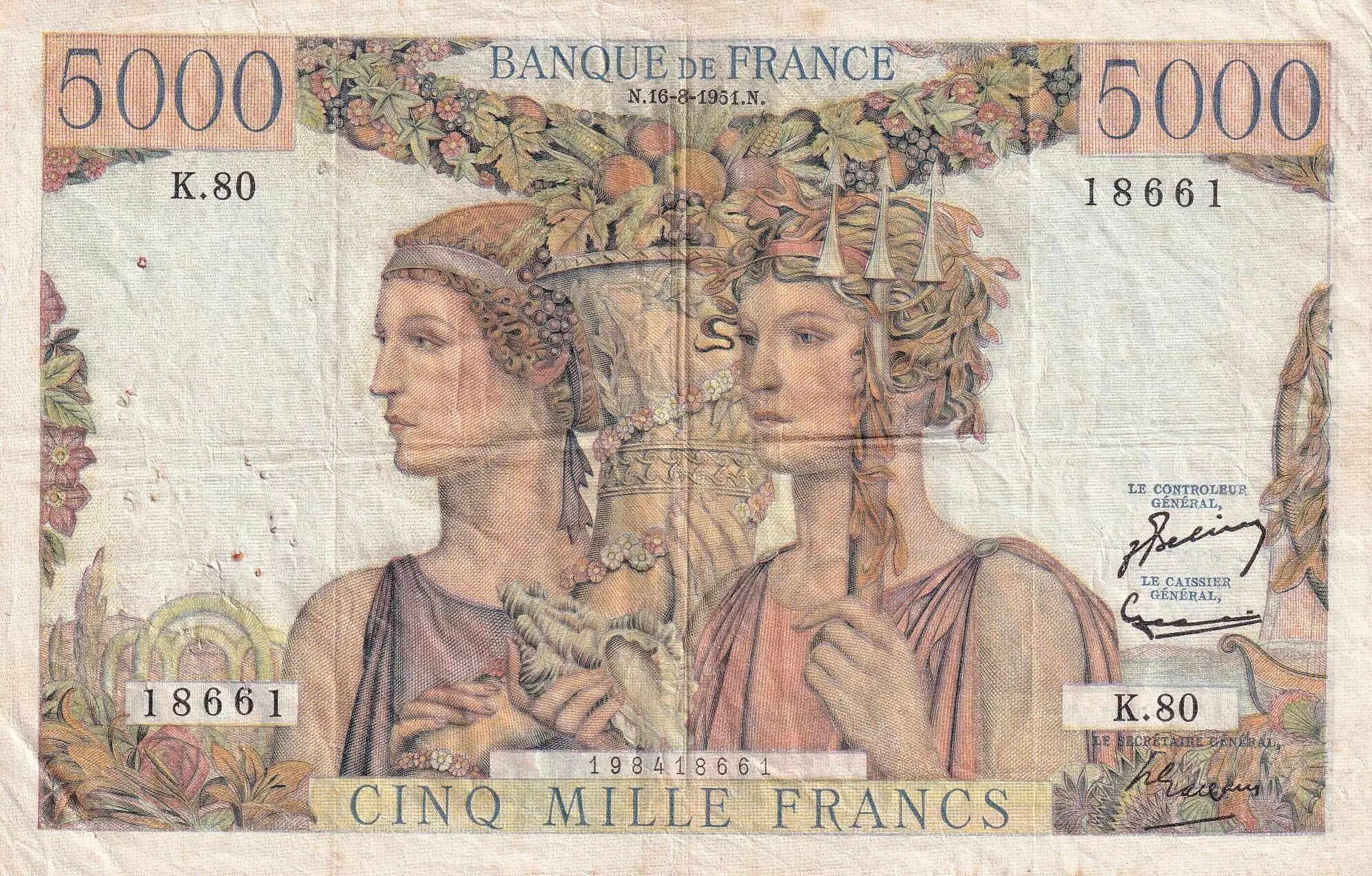 Home > > France 5000 Francs - Sea and Countryside - 16-08-1951 - Serial K.80 - F.48.05