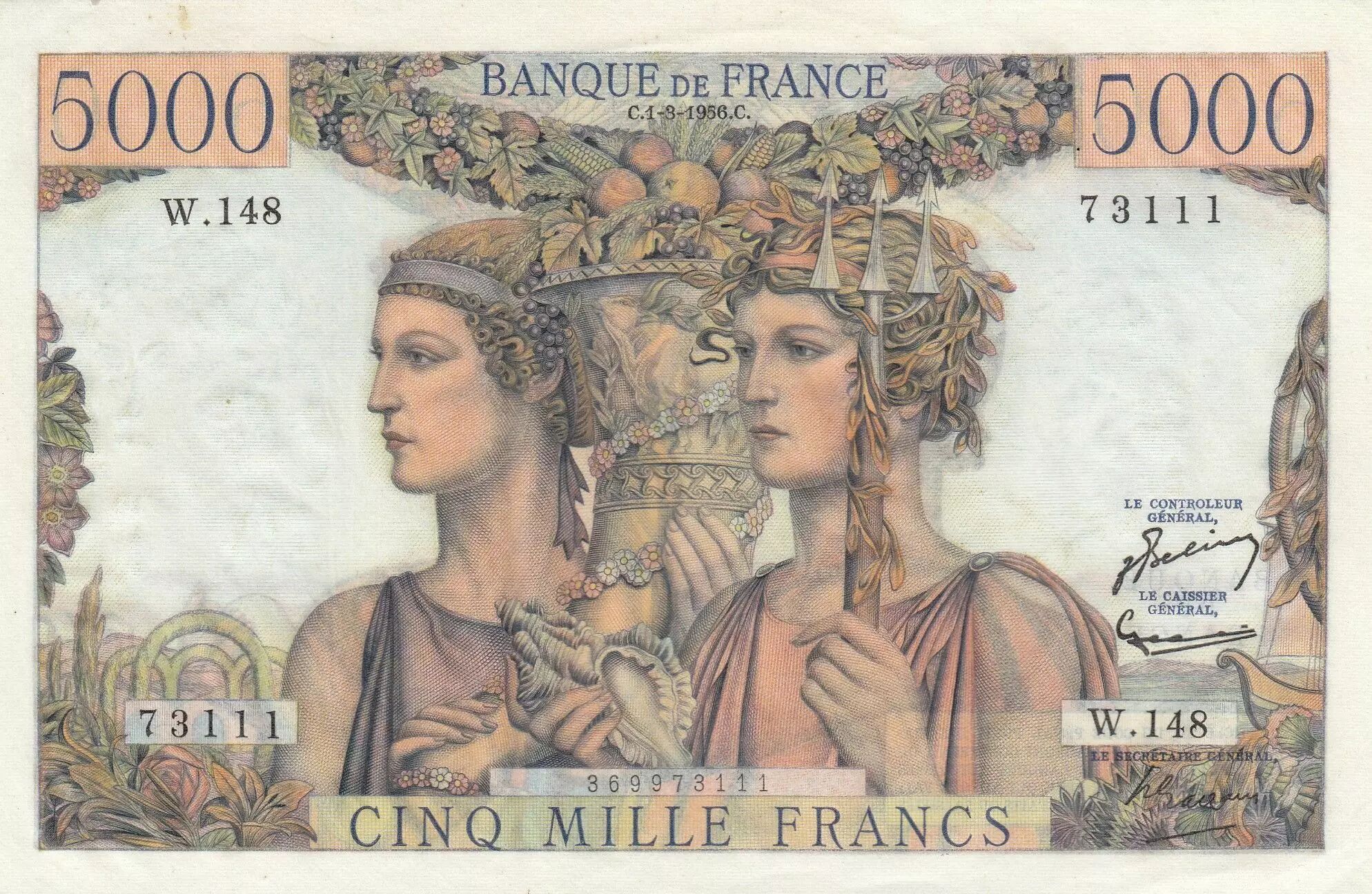 Le billet de 5000 francs Terre et Mer, émis le 1er mars 1956, représente une valeur nominale de 5000 francs français. Ce billet appartient à une série spécifique, désignée par la lettre W suivie du numéro 148.