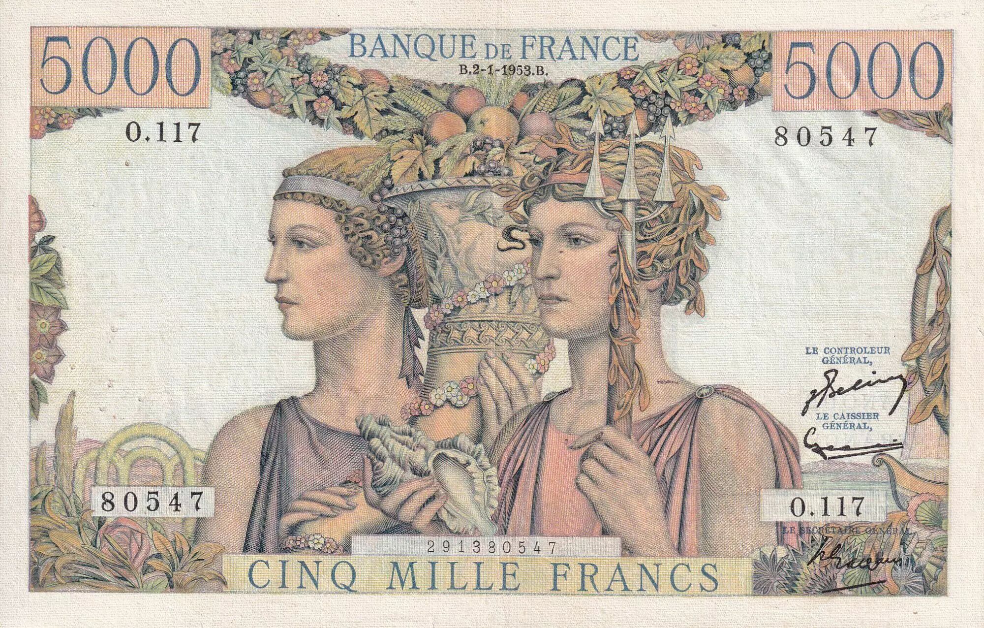 Accueil > Archivage > France 5000 Francs - Terre et Mer - 02-01-1953 - Série O.117 - F.48.08