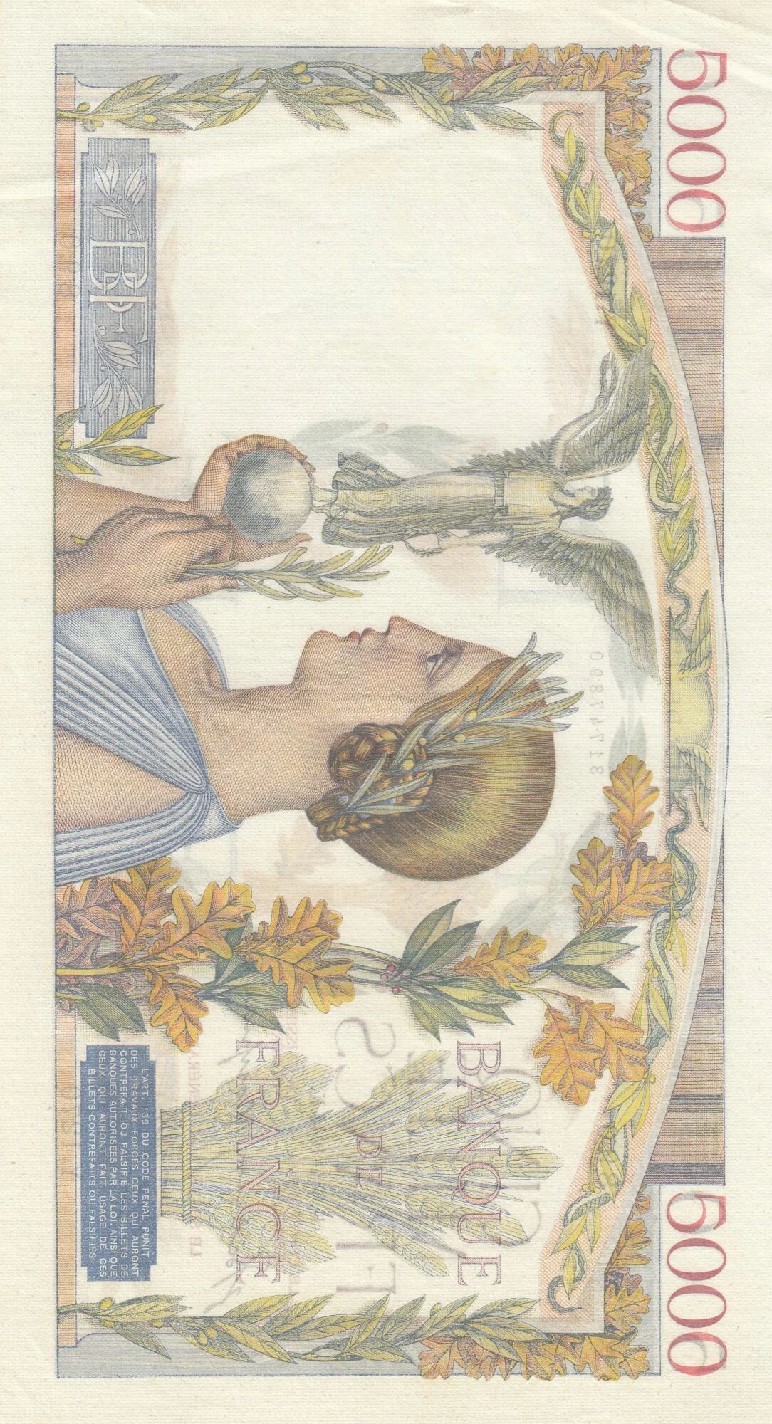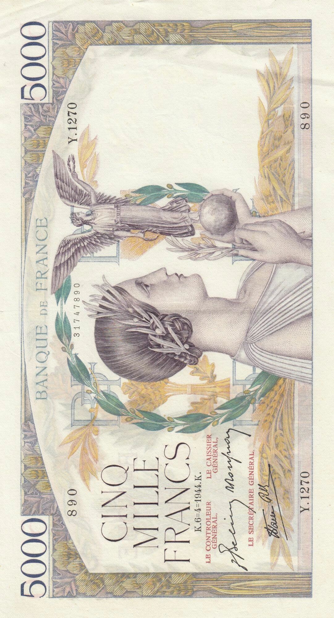 Ce billet de banque français a une valeur nominale de 5000 francs. Il a été émis en 1944.