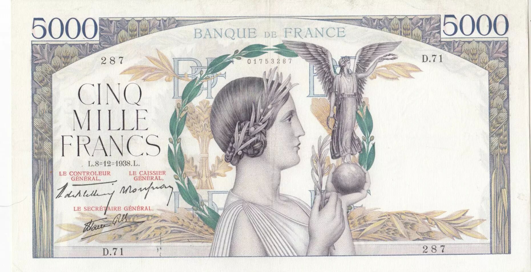 Billet France 5000 Francs Victoire - 08-12-1938 Série D.71-287 - TTB