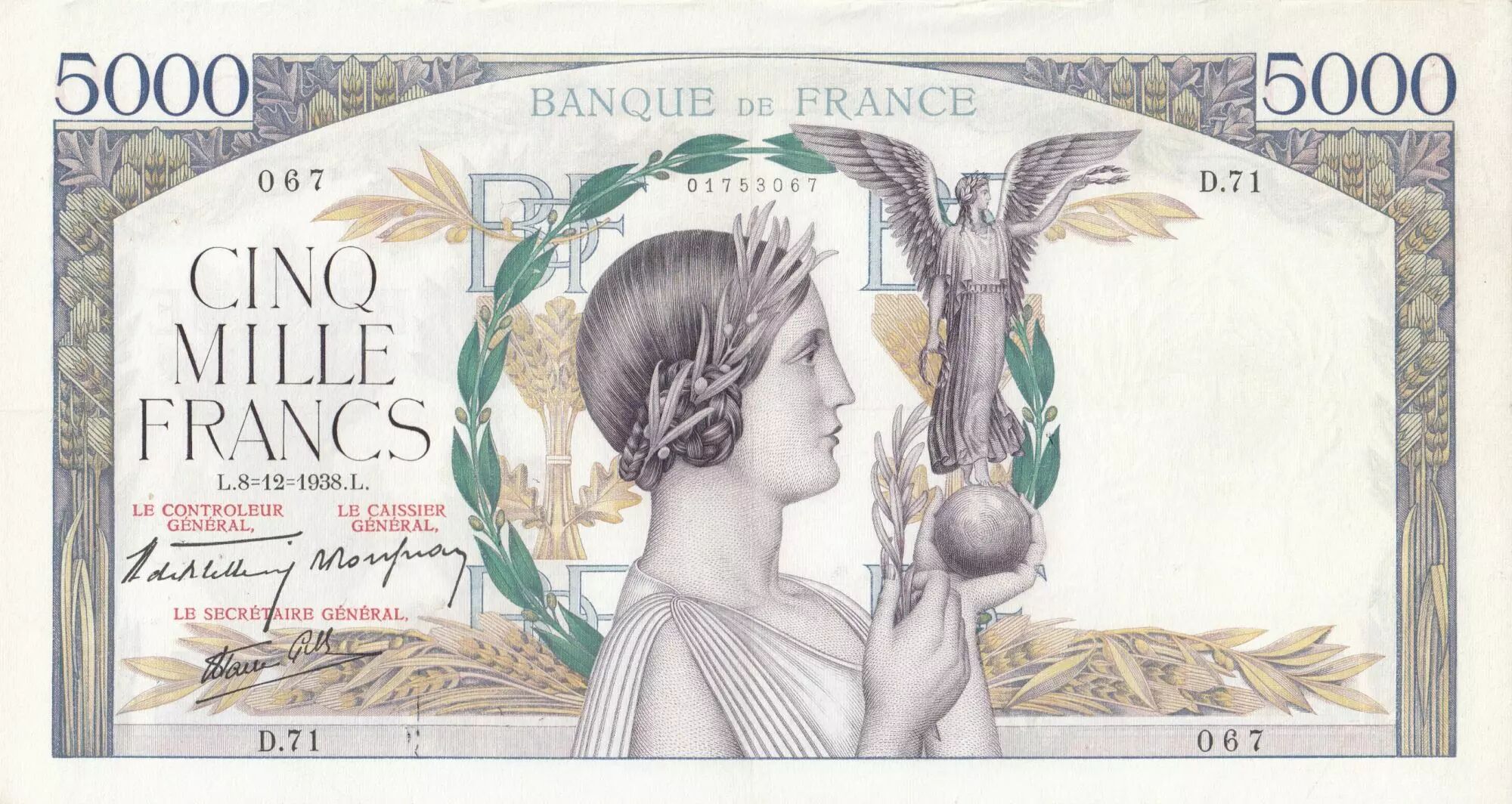 Billet France 5000 Francs Victoire - 08-12-1938 Série D.71 - TTB