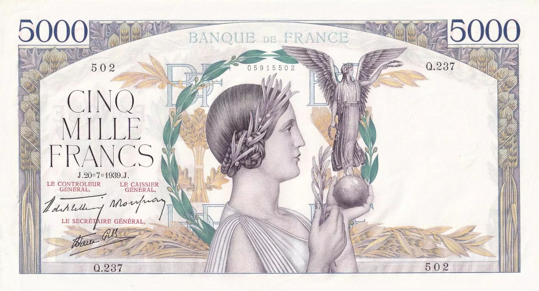 Accueil > Archivage > archivage-Billets Français > France 5000 Francs Victoire - 20-07-1939 - Série Q.237