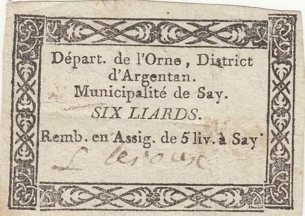 Billet France 6 liards - Orne - District d'Argentan, municipalité de Say - 1792