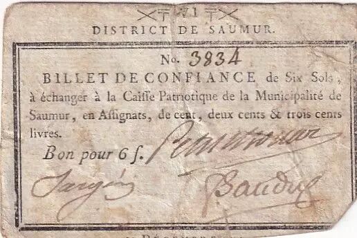 Banknote France 6 Sols - Maine et loire - District de Saumur - 30-12-1791