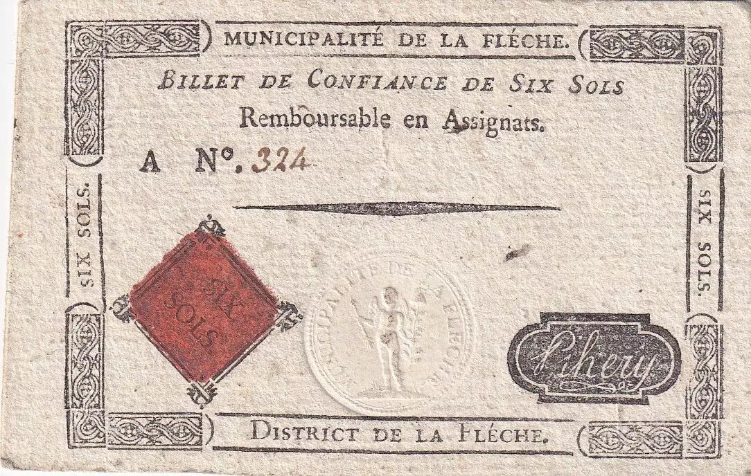 Billet France 6 Sols - Sarthe - Municipalité de la Flèche - Série A - 1791