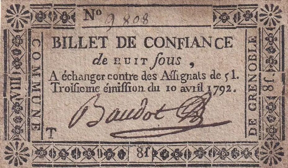 Banknote France 8 Sous - Isère - Commune de Grenoble - 1792