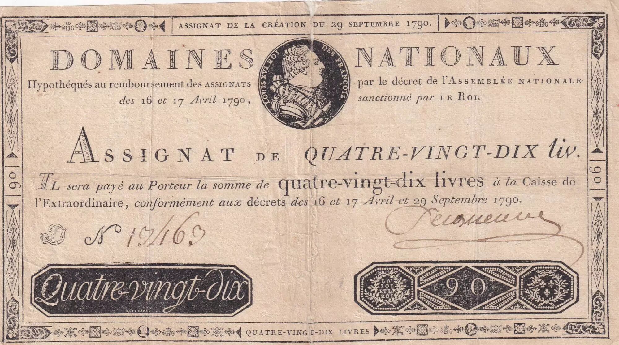 Banknote France 90 Livres Louis XVI - 29-09-1790 - Serial D 13463