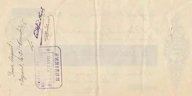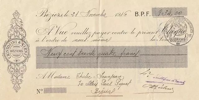 Home > World Banknotes > Checks and Traveler's Checks > France 934 francs - Bank cheque receipt - Christofini et Vernet - 21-11-1916