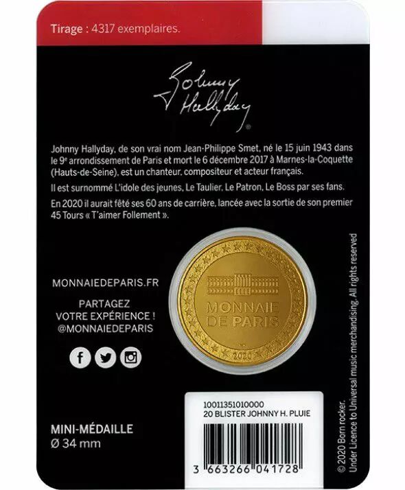 Pièce France Blister Johnny Hallyday (Pluie) - Médaille 2020 par la Monnaie de Paris