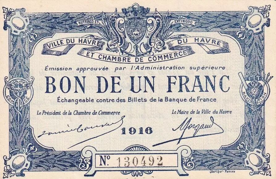 This 1 franc banknote was issued in 1916 by the Chamber of Commerce of Le Havre, France. It is a bond, a form of emergency currency issued during periods of cash shortage.