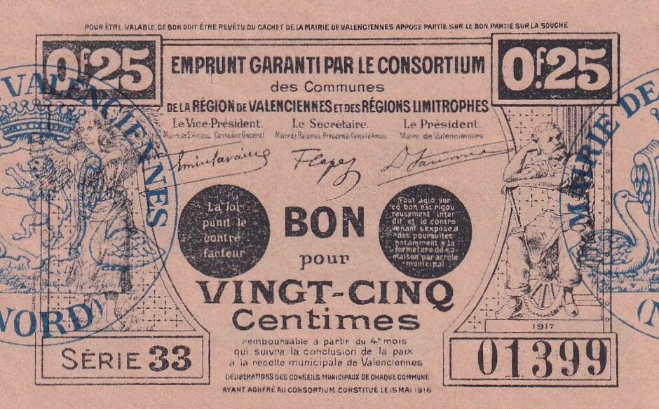 Le bon de nécessité de 0,25 centime émis à Valenciennes en 1917 (série 33) appartient aux émissions locales de très faible valeur mises en circulation durant la Première Guerre mondiale. Dans les régions du Nord occupées, la pénurie de monnaie divisionnaire devient telle que même les plus petites unités monétaires doivent être remplacées par des bons.