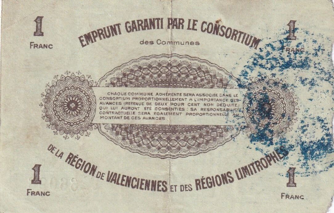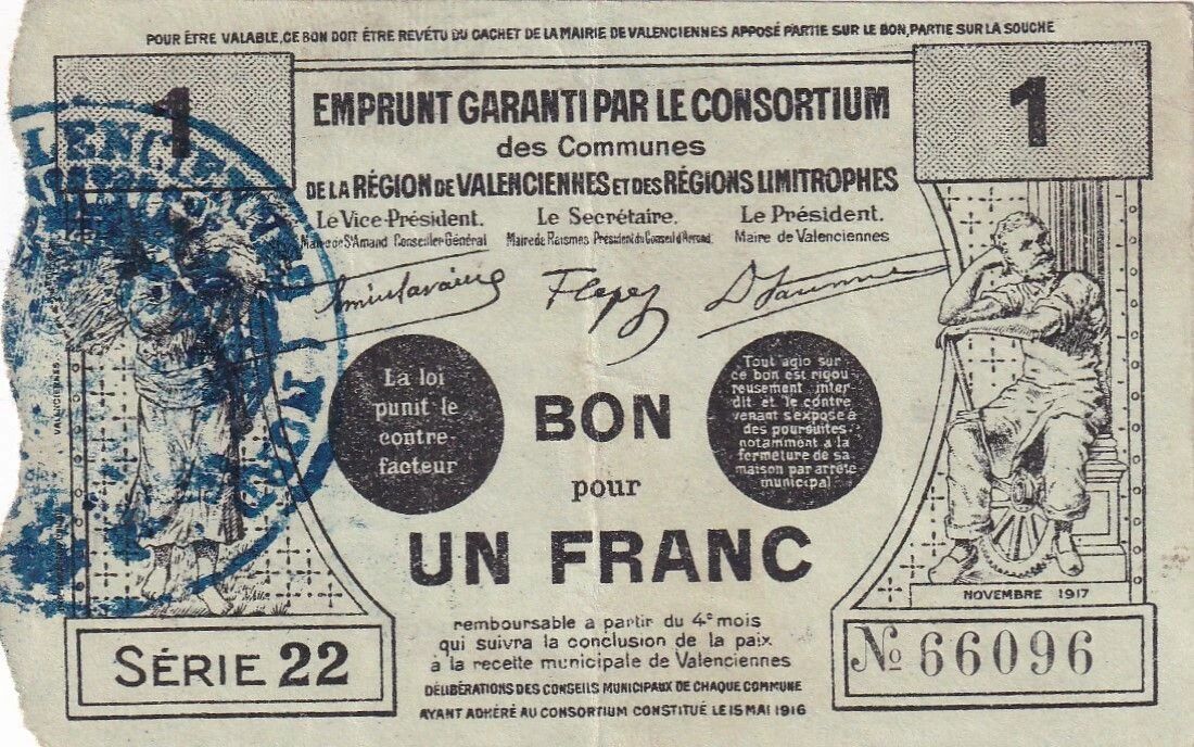 Le bon de nécessité de 1 franc émis à Valenciennes en novembre 1917 (série 22) appartient aux émissions monétaires locales de la fin de la Première Guerre mondiale. Dans les régions du Nord occupées, la pénurie prolongée de monnaie divisionnaire et les difficultés d?approvisionnement en billets officiels contraignent les autorités locales à maintenir ces systèmes alternatifs.