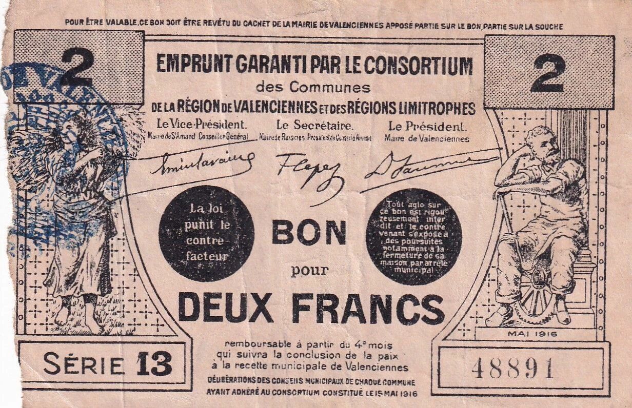 Valenciennes, fortement touchée par l?occupation allemande, met en circulation ces bons afin de maintenir l?activité économique et soutenir la population. Cette émission s?inscrit dans le cadre de l??emprunt garanti par le consortium des communes de la région de Valenciennes et des régions limitrophes?, un système collectif visant à garantir la valeur et la circulation de ces billets.