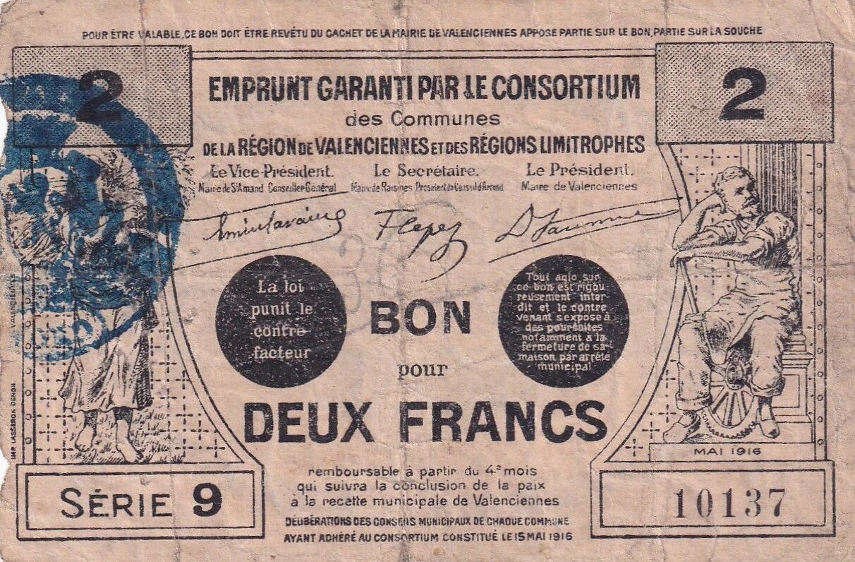 Sur le plan numismatique, le 2 francs Valenciennes 1916 ? série 9 est une pièce intéressante :