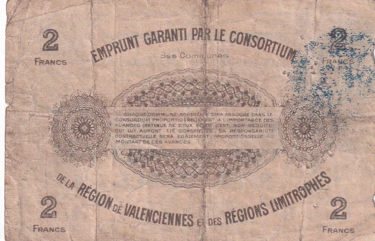 Valenciennes, fortement impactée par l?occupation allemande, émet ces bons afin de maintenir les échanges économiques et de soutenir la population. Cette émission s?inscrit dans le cadre de l??emprunt garanti par le consortium des communes de la région de Valenciennes et des régions limitrophes?, un dispositif collectif visant à garantir la valeur de ces billets.