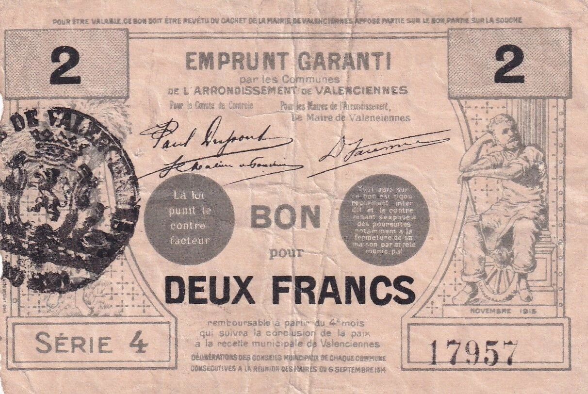 Valenciennes, fortement touchée par l?occupation allemande dès le début du conflit, met en circulation ces bons afin de maintenir les échanges économiques et d?assurer la continuité de la vie quotidienne. Cette émission s?inscrit dans le cadre de l??emprunt garanti par le consortium des communes de la région de Valenciennes et des régions limitrophes?, dispositif collectif destiné à garantir la valeur et l?acceptation de ces billets.
