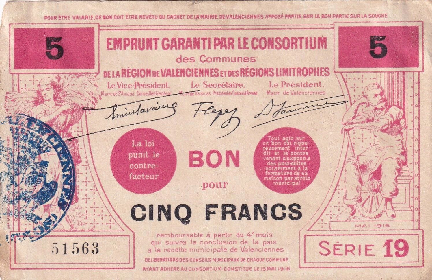 Le bon de nécessité de 5 francs émis à Valenciennes en mai 1916 (série 19) appartient aux émissions monétaires locales créées durant la Première Guerre mondiale. Dans les régions occupées du Nord de la France, la disparition de la monnaie métallique et les difficultés d?approvisionnement en billets officiels obligent les autorités locales à mettre en place des solutions alternatives.