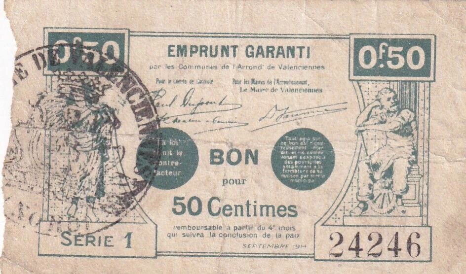 Le bon de nécessité de 50 centimes émis à Valenciennes en septembre 1914 (série 1) appartient aux toutes premières émissions locales apparues dès le début de la Première Guerre mondiale. Il s?agit d?une réponse immédiate à la disparition brutale de la monnaie divisionnaire, provoquée par la thésaurisation et les perturbations économiques liées au conflit.