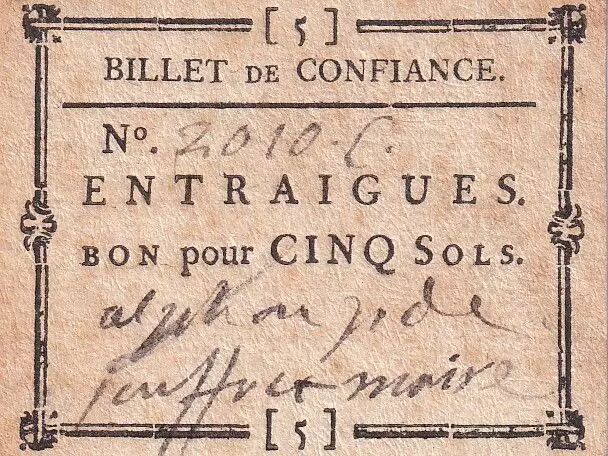 Accueil > Billets Français > Billets de Nécessités (1789-1945) > Billets de Confiance 1789-1793 > France Bon pour 5 Sols - Billet de Confiance - Vaucluse - Entraigues - n°2010
