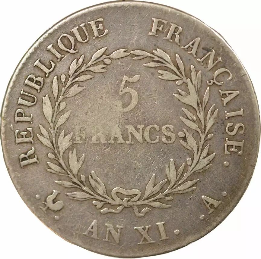 Coin France Bonaparte Ist Consul - 5 Silver Francs - Year XI A Paris
