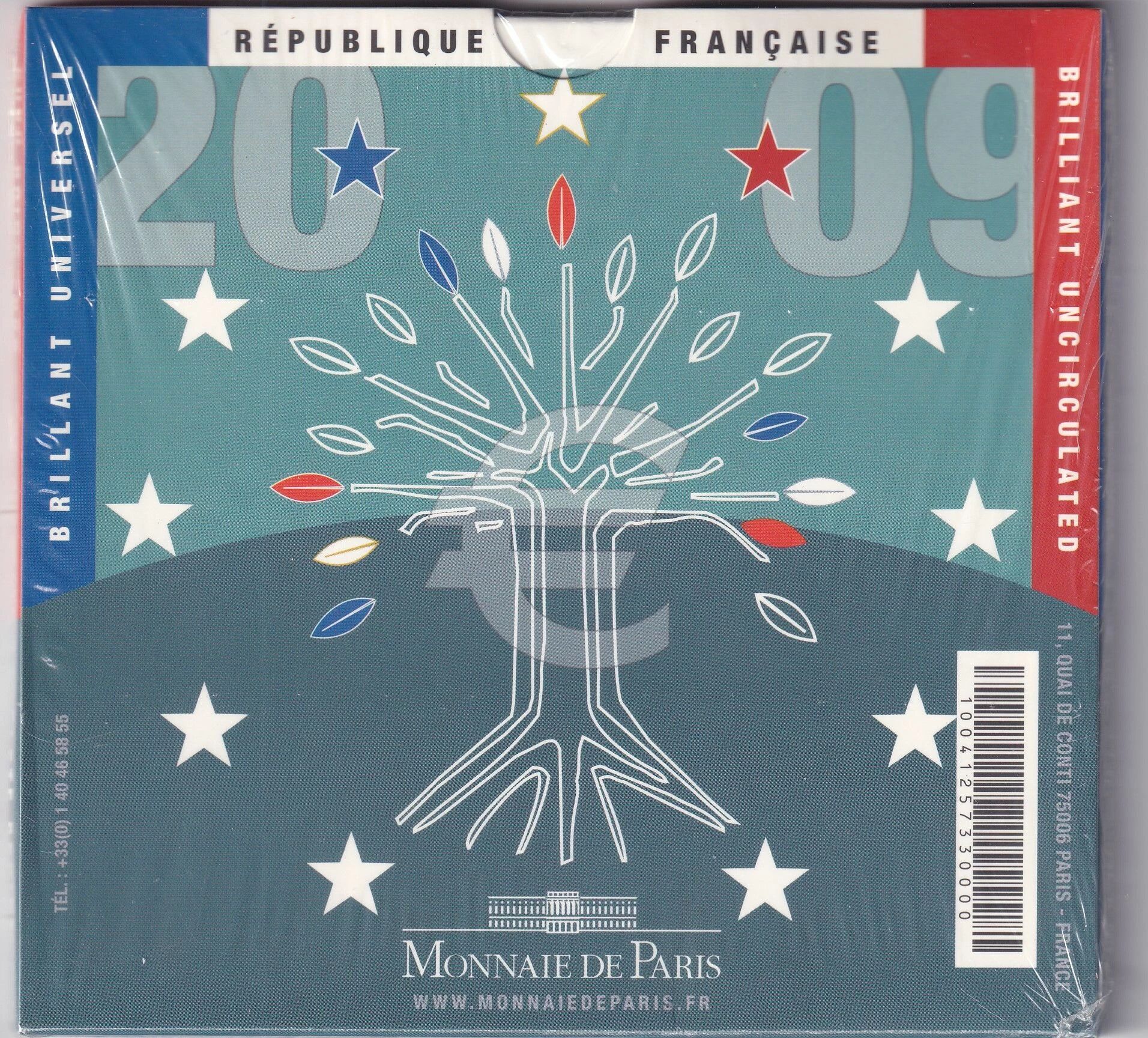 This numismatic set contains all the French circulation coins, ranging from 1 cent to 2 euros, issued in 2009. The coins are presented in their Brilliant Uncirculated (BU) quality, which means they were struck with special care and have a new and shiny appearance.