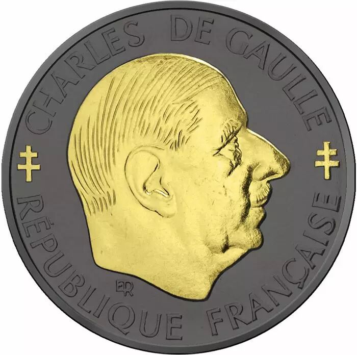 Un hommage exceptionnel à celui qui partit à Londres pour lutter contre l'occupant et qui fut le fondateur de la Ve République. C'est la fameuse pièce de 1 franc de 1988 ayant reçue une application métallique combinant ruthénium or et couleur ! Cette combinaison des ces trois techniques permet de sublimer ce grand classique de la numismatique moderne frappée par la Monnaie de Paris en 1988. Cette application est effectué par un institut privé.