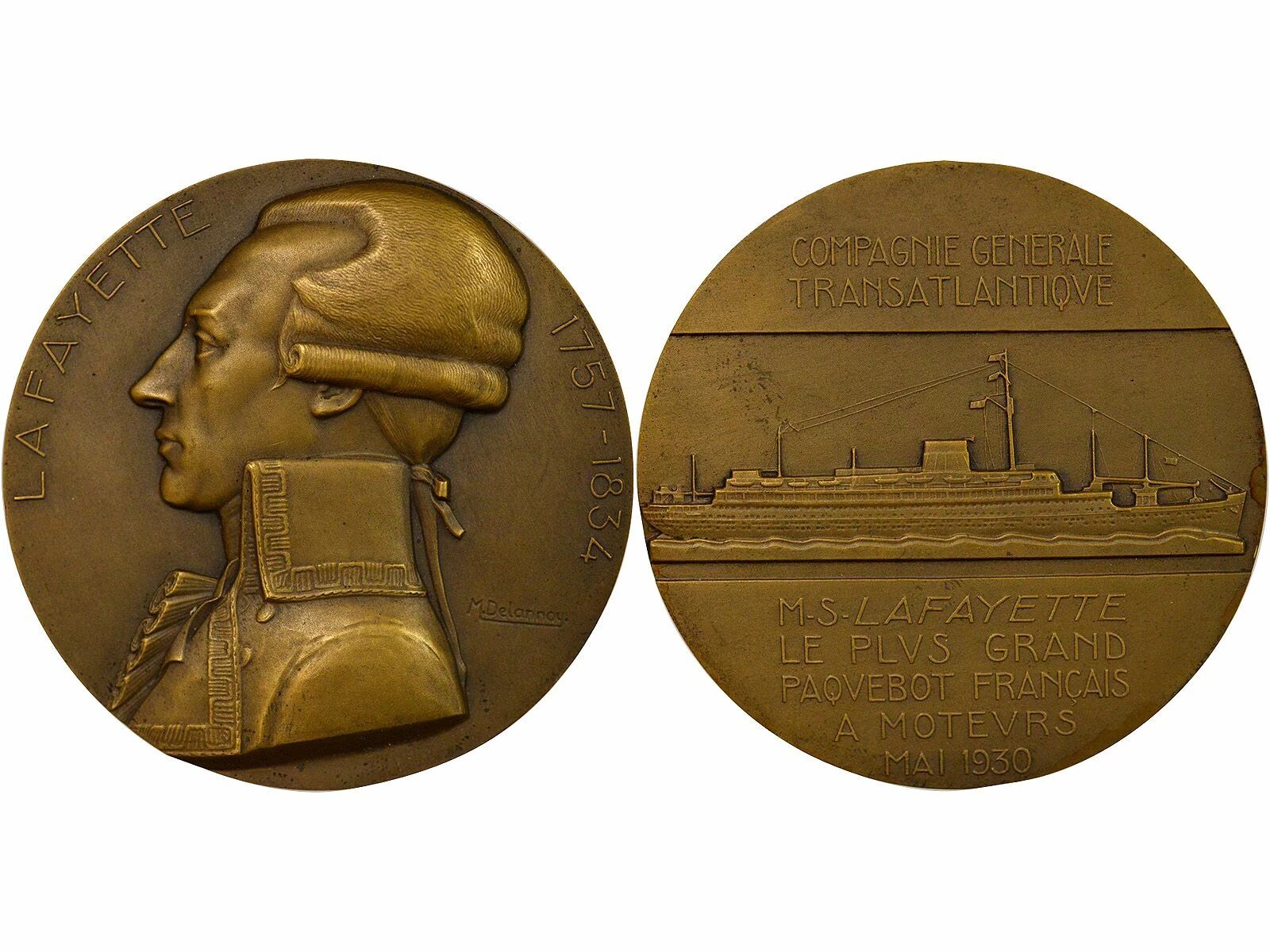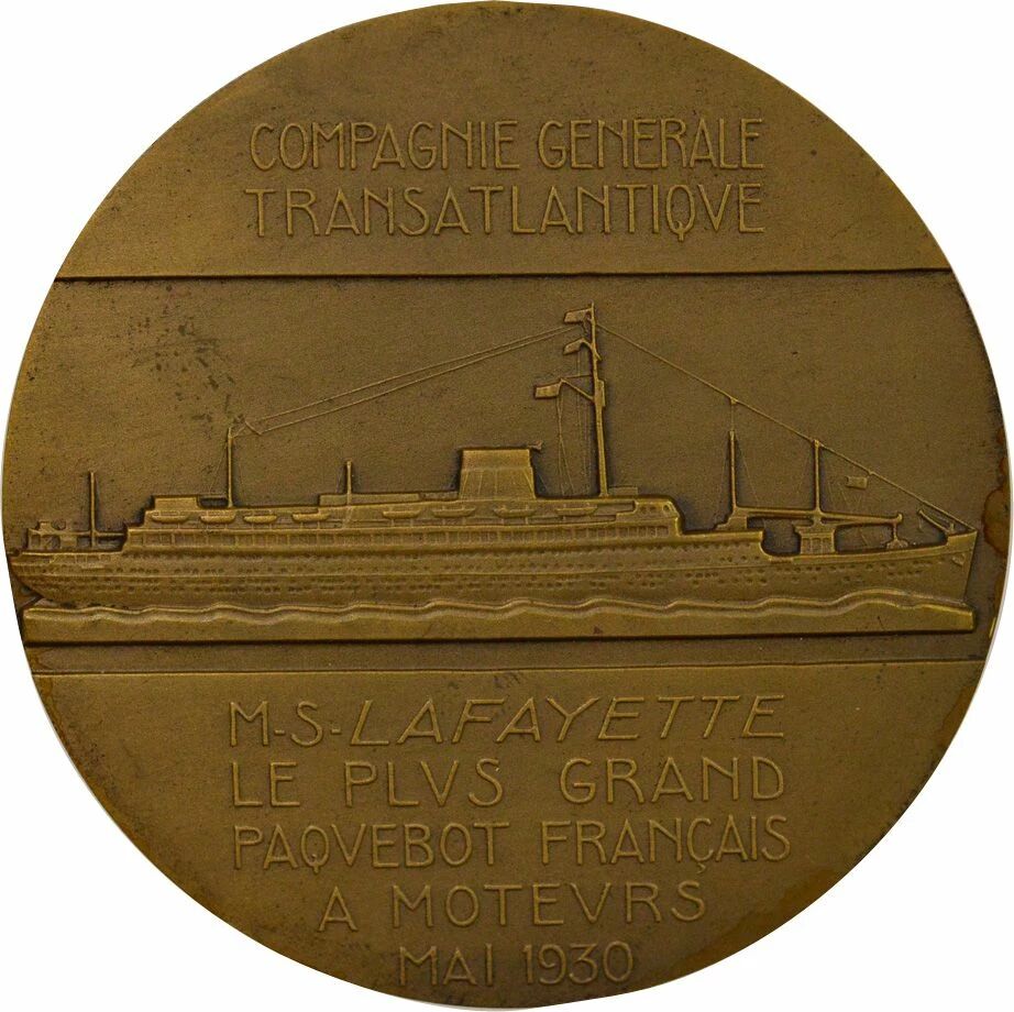 Reverse : COMPAGNIE GENERALE / TRANSATLANTIQVE / M. S. LAFAYETTE / LE PLVS GRAND / PAQVEBOT FRANÇAIS / A MOTEVRS / MAI 1930