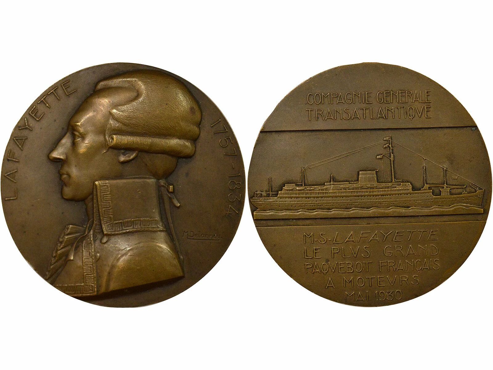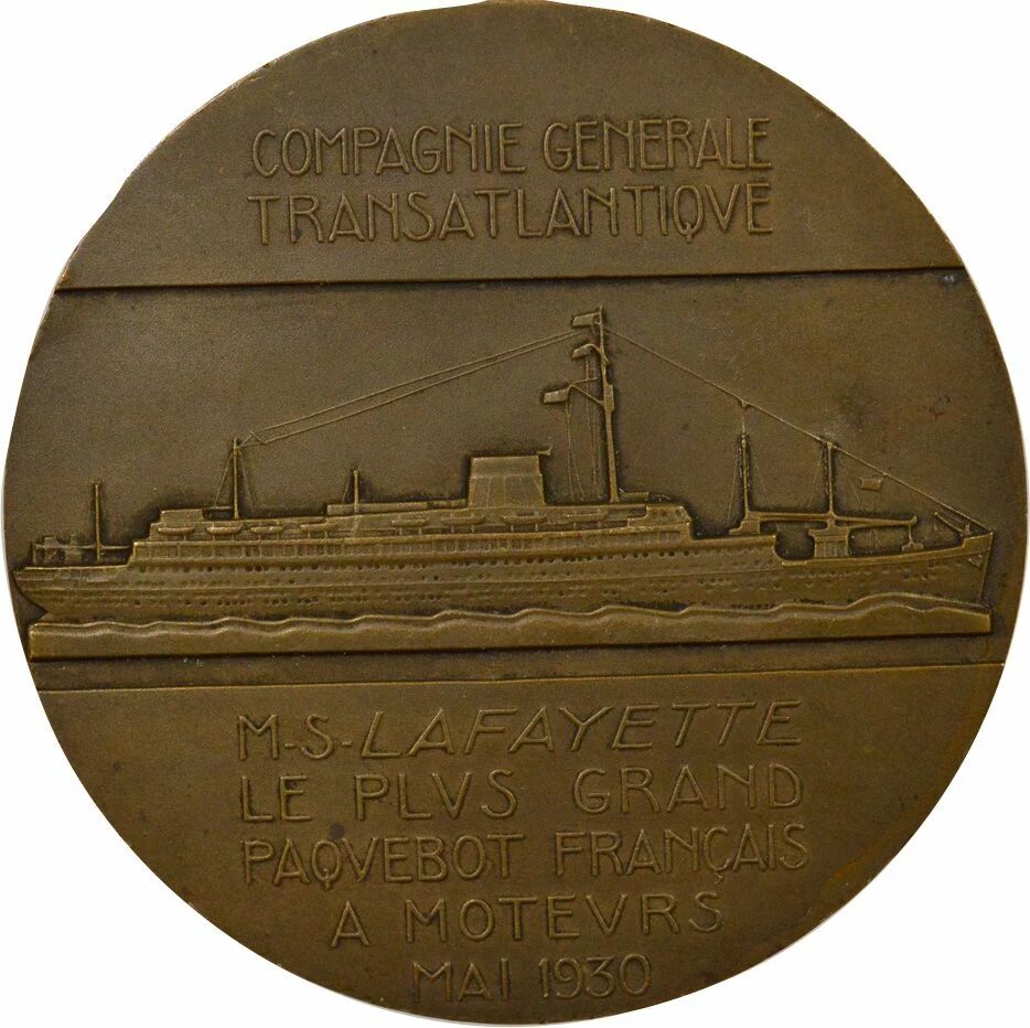 Reverse : COMPAGNIE GENERALE / TRANSATLANTIQVE / M. S. LAFAYETTE / LE PLVS GRAND / PAQVEBOT FRANÇAIS / A MOTEVRS / MAI 1930