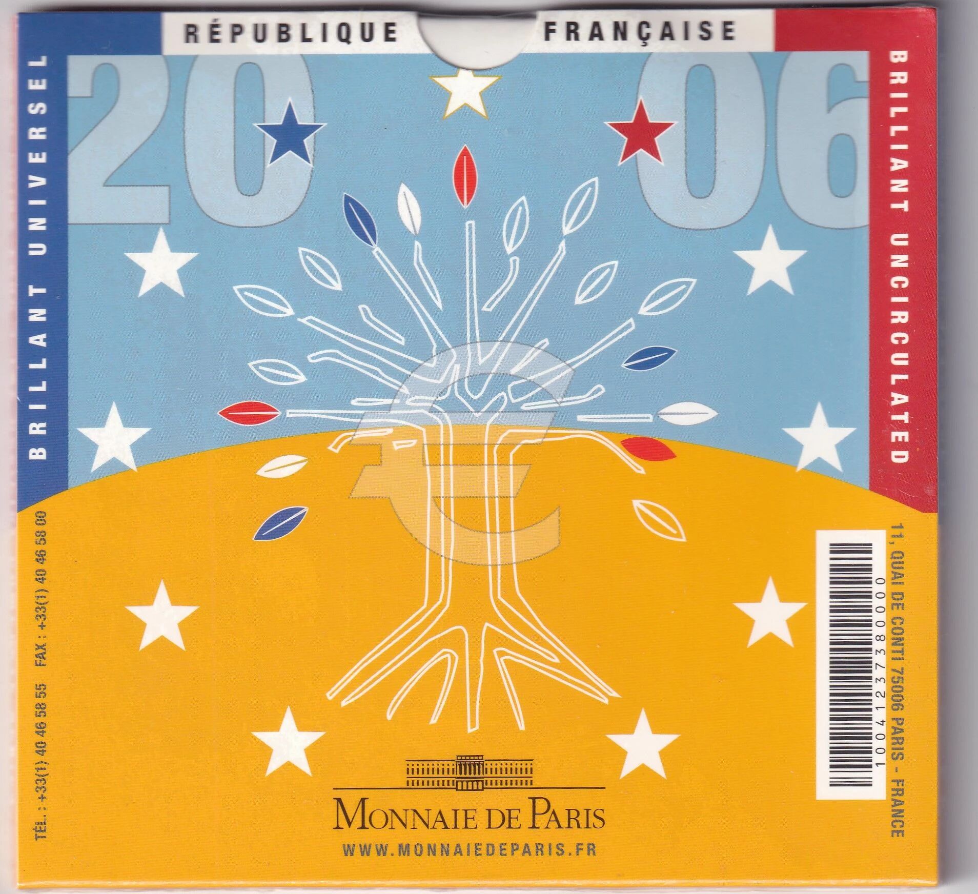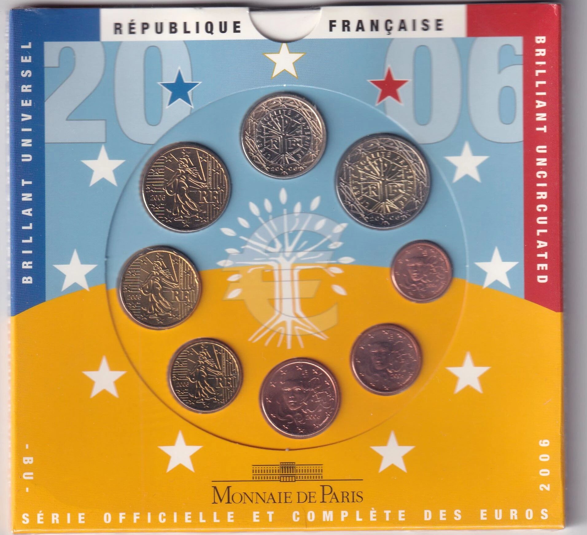 Ce coffret numismatique regroupe l'ensemble des huit coupures de monnaie en euros émises par la France en 2006, allant de 1 centime à 2 euros. Chaque pièce présente les caractéristiques techniques et esthétiques définies par les règlements européens en vigueur lors de leur émission.