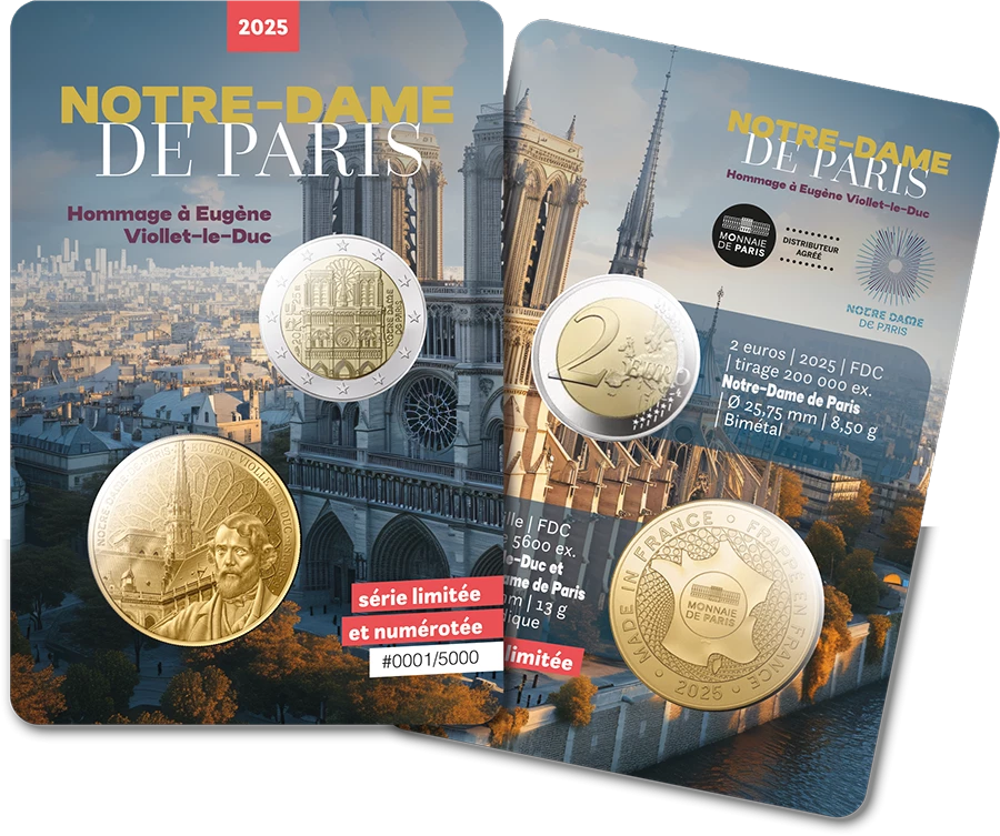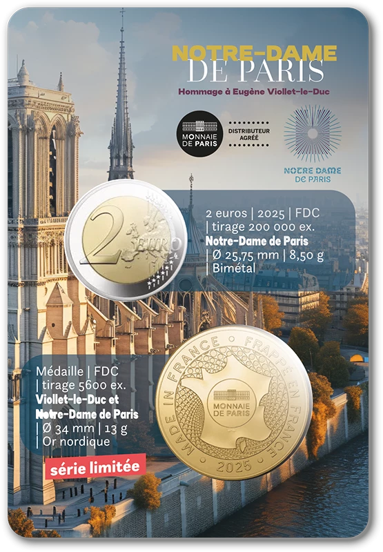 A l'occasion de l'hommage de la France à la cathédrale Notre-Dame de Paris avec la nouvelle 2 euros commémorative de la Monnaie de Paris, Emonnaies vous propose un coincard exclusif officiel ( agréé par la Monnaie de Paris et la fondation Notre-Dame de Paris) ! Ce coincard comprend une pièce de 2 euros FDC Notre-Dame de Paris France 2025 ainsi qu'une mini-médaille exclusive frappée par la Monnaie de Paris !