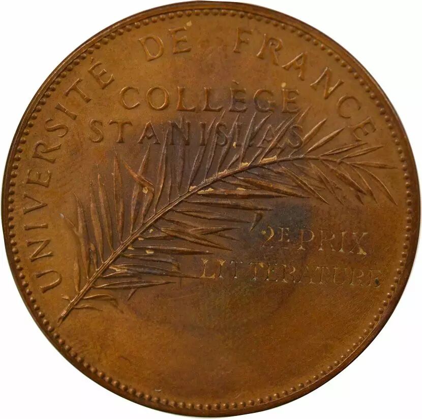 Revers : UNIVERSITE DE FRANCE / COLLEGE STANISLAS / 2E PRIX / LITTERATURE