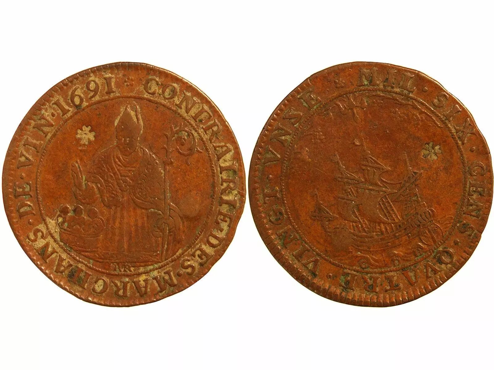 Accueil > Jetons Médailles Décorations > Jetons ( depuis 1600 ) > France Corporations, Marchands De Vin Taverniers - Jeton Cuivre 1691 - F.5397
