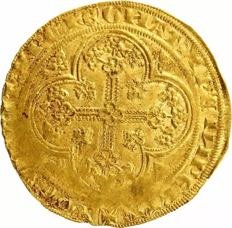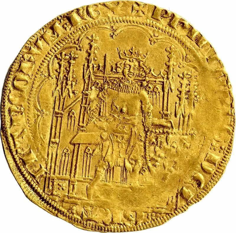 Roi de France de 1328 à 1350 Philippe VI de Valois a émis cet Écu d'or dit à la chaise" représentant le Roi assis dans une stalle gothique vêtu du haubert et de la cotte d'armes tenant l'épée et l'écu de France. Cette monnaie a été émise en 1337.