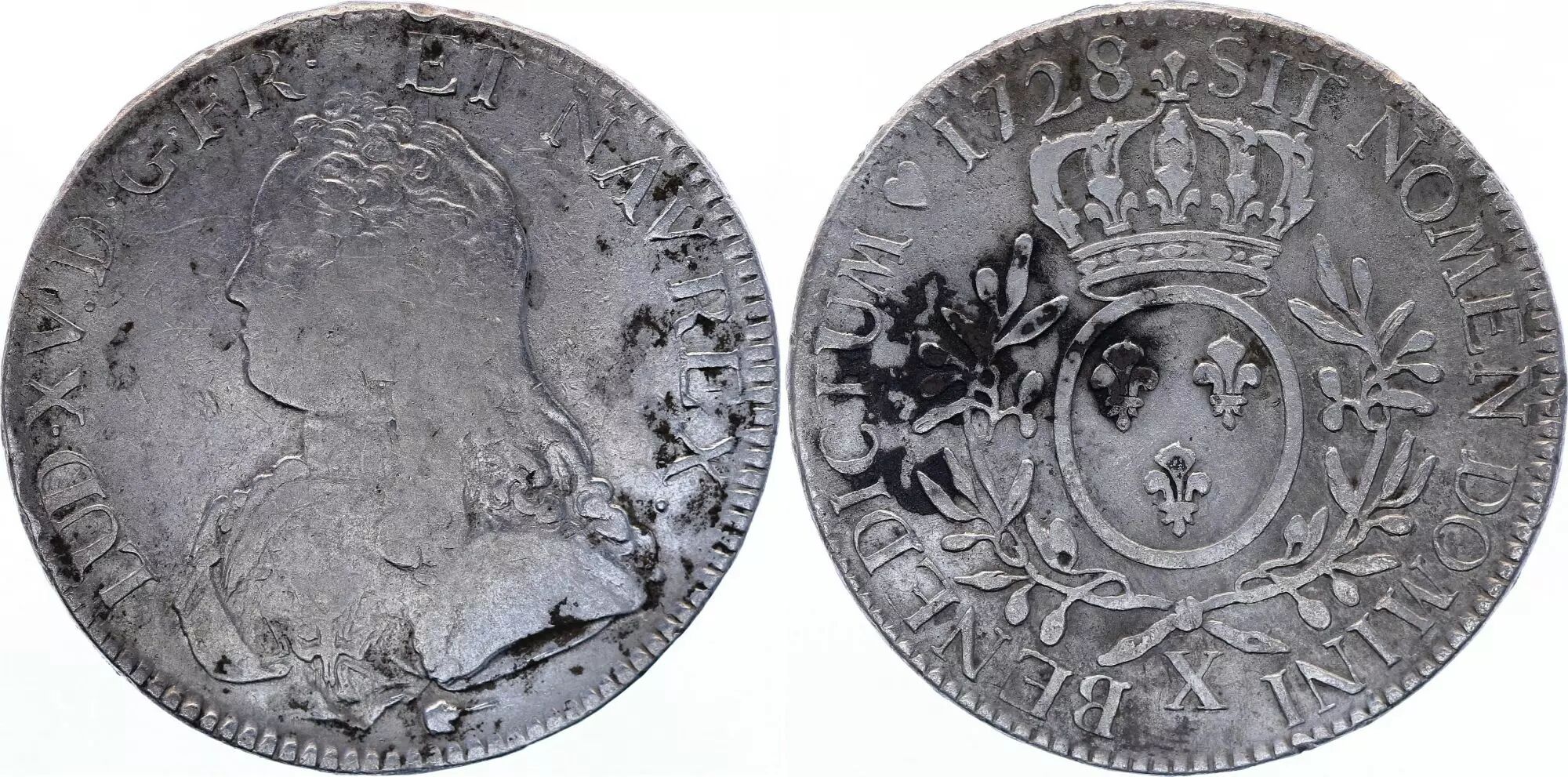 Coin France Ecu Louis XV arms of France with sprays - 1728 X AMIENS