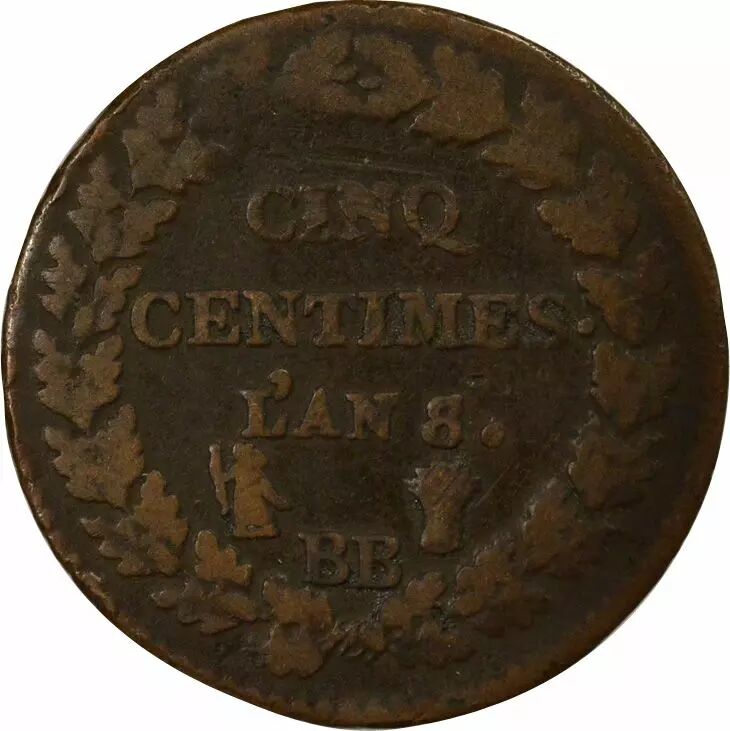 Home > French coins (470 à 2002) > Modern Currencies (1789 to 2002) > 5 Centimes > France French Directory, 5 Centimes, Dupré Big Diameter - Year 8 BB Strasbourg