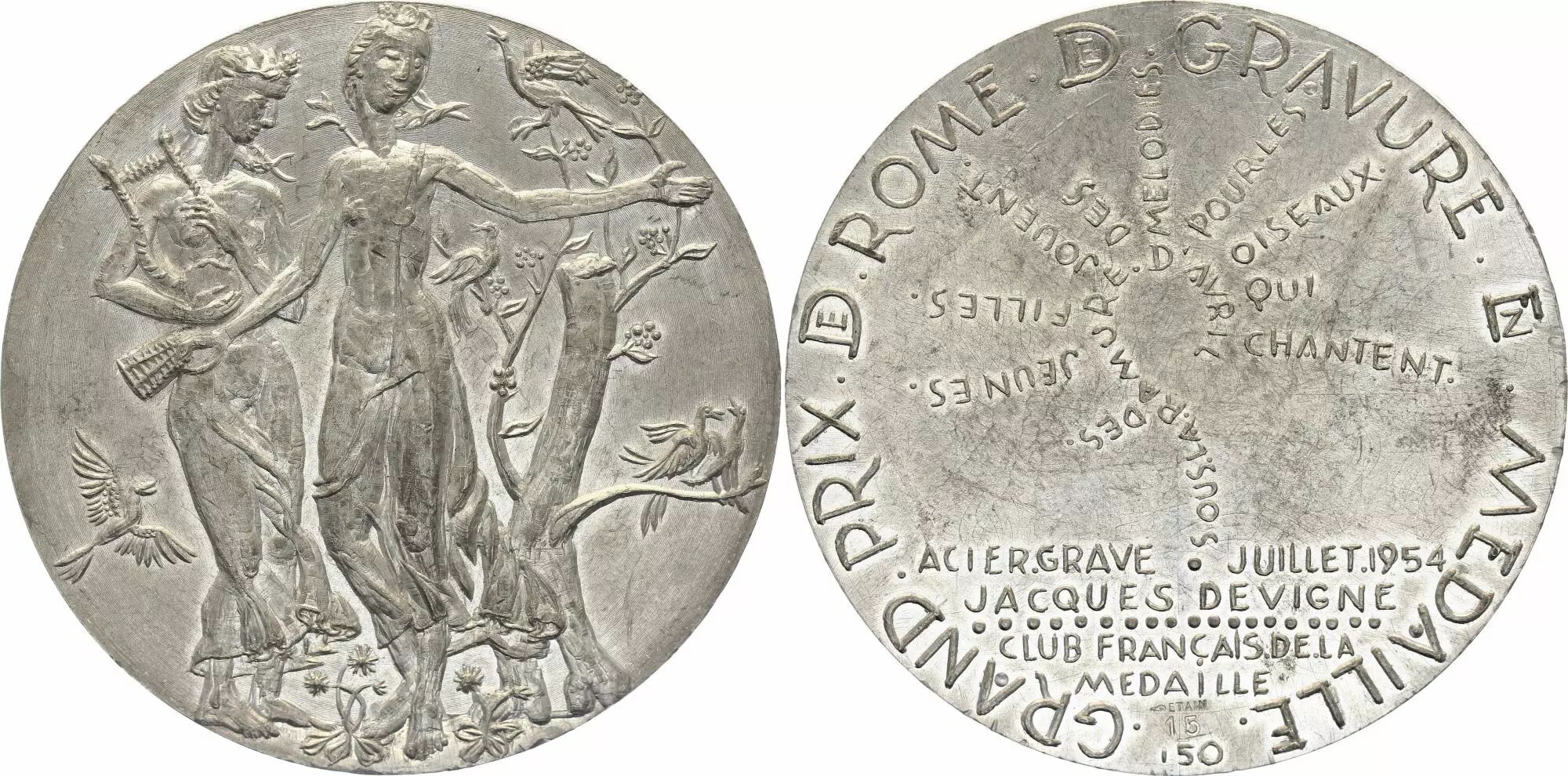 Jacques Devigne, as an engraver, brought his expertise and artistic vision to the design of this medal. His work testifies to the tradition of artistic excellence associated with the Grand Prix de Rome, an institution that played an important role in the training and recognition of French artists.