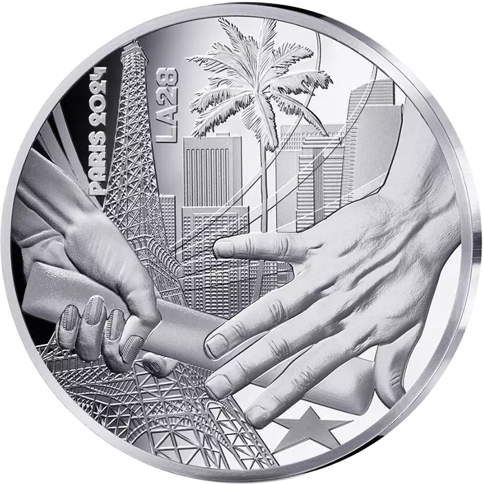 This collector's coin symbolizes the relay transmission between France and Los Angeles, two host nations of the Games. The obverse shows the passing of the baton between a French sportswoman (identified by the decoration of her nails) and an American sportsman. In the background, the Los Angeles skyline with a palm tree, an emblematic tree of this city, a star to recall Hollywood Boulevard and the Eiffel Tower.