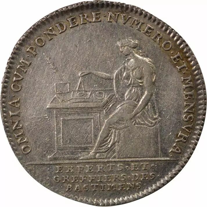 Revers : OMNIA . CVM . PONDERE . NVMERO . ET . MENSVRA . / . EXPERTS . ET . / GREFFIERS . DES . / . BASTIMENS .