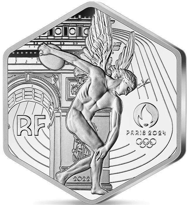 After Marianne the face of these coins features Le Génie throwing a discus overlooking the athletics stadium of the Paris 2024 Olympic and Paralympic Games. The background also features the Arc de Triomphe, symbolising the city of Paris.