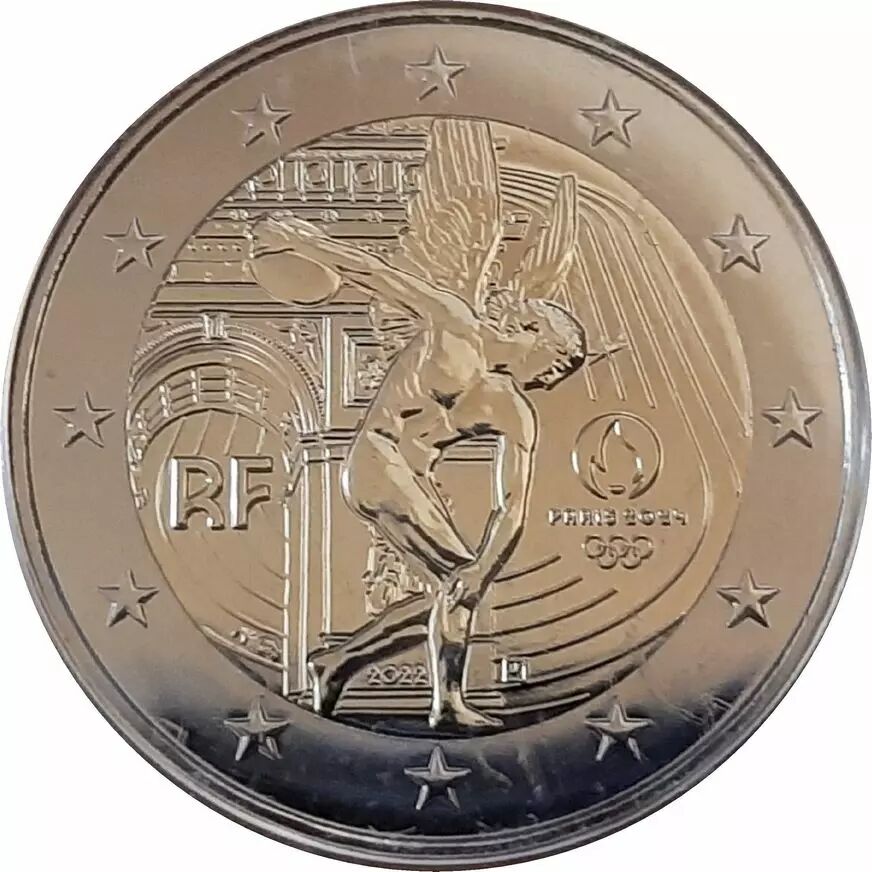 Après Marianne la face de ces monnaies présente le Génie en train de lancer un disque surplombant le stade d?athlétisme des Jeux Olympiques et Paralympiques de Paris 2024. On retrouve également l?Arc de Triomphe en fond symbolisant ici la ville de Paris. Les différents de l'Institut Monétaire français le millésime ainsi que les initiales de la République Française se trouvent également sur la monnaie.
