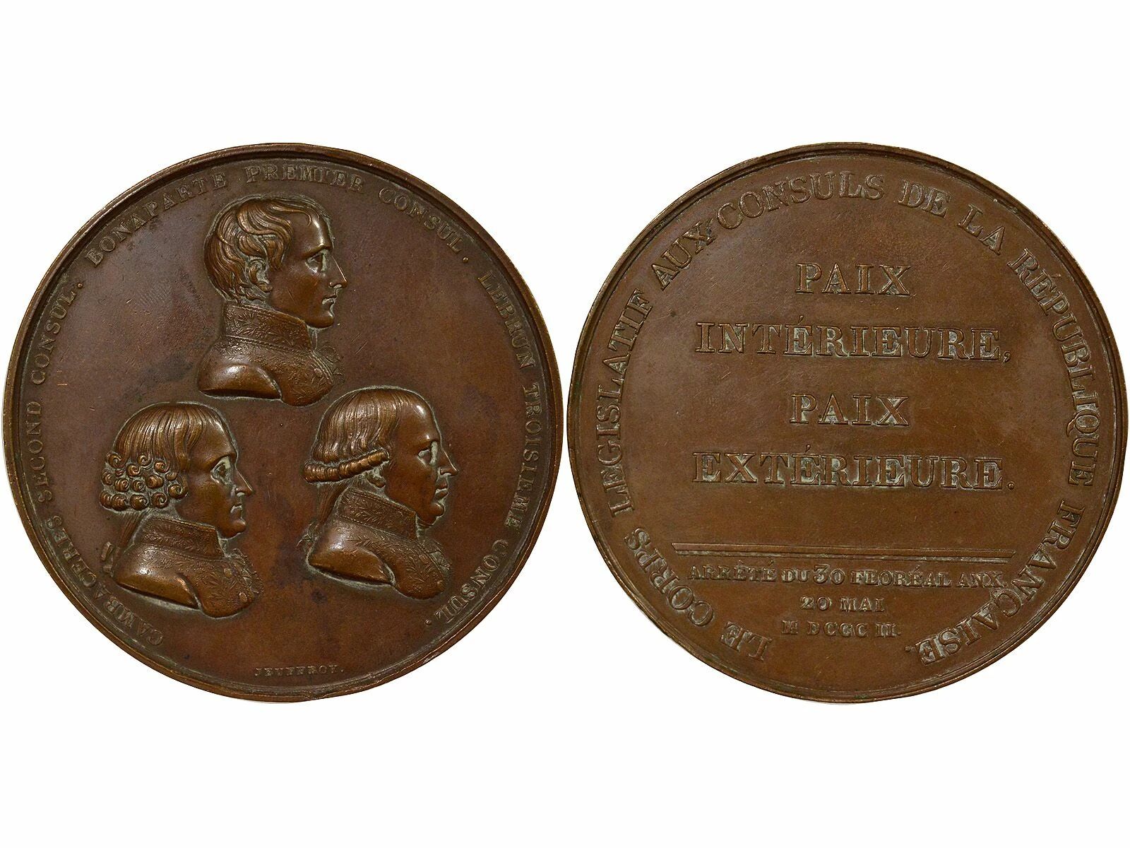 Reverse : LE CORPS LEGISLATIF AUX CONSULS DE LA REPUBLIQUE FRANCAISE . / PAIX / INTERIEURE . / PAIX / EXTERIEURE . / ARRETE DU 30 FLOREAL AN X . / 20 MAI / X DLLL II .