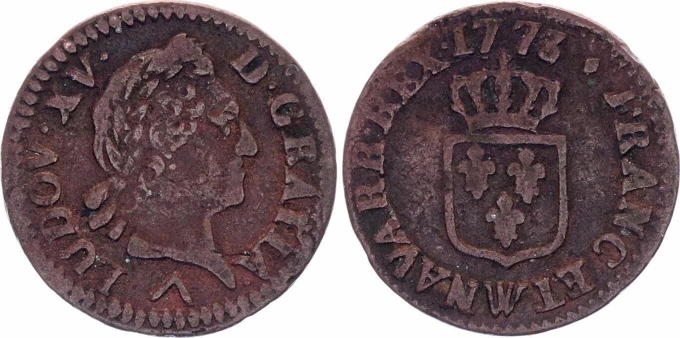 Il s'agit d'une pièce de monnaie française, un liard, frappée sous le règne de Louis XV. La pièce date de 1773.