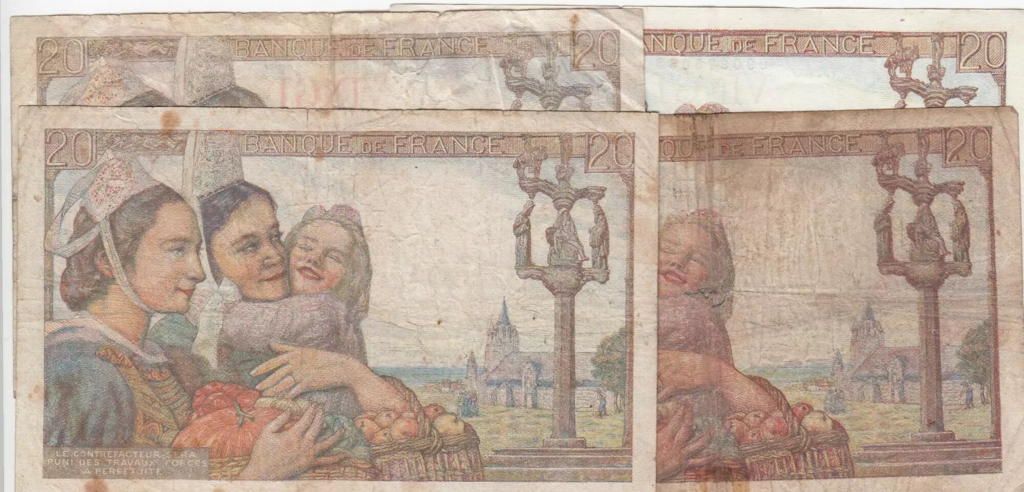 Plis, salissures, épinglages, coupures en marge, 4 billets différents 1942 à 1944.