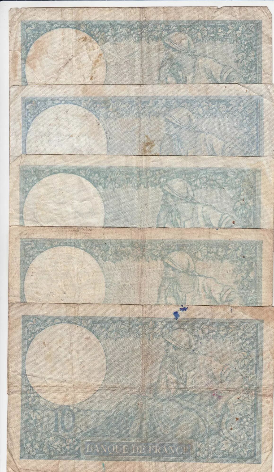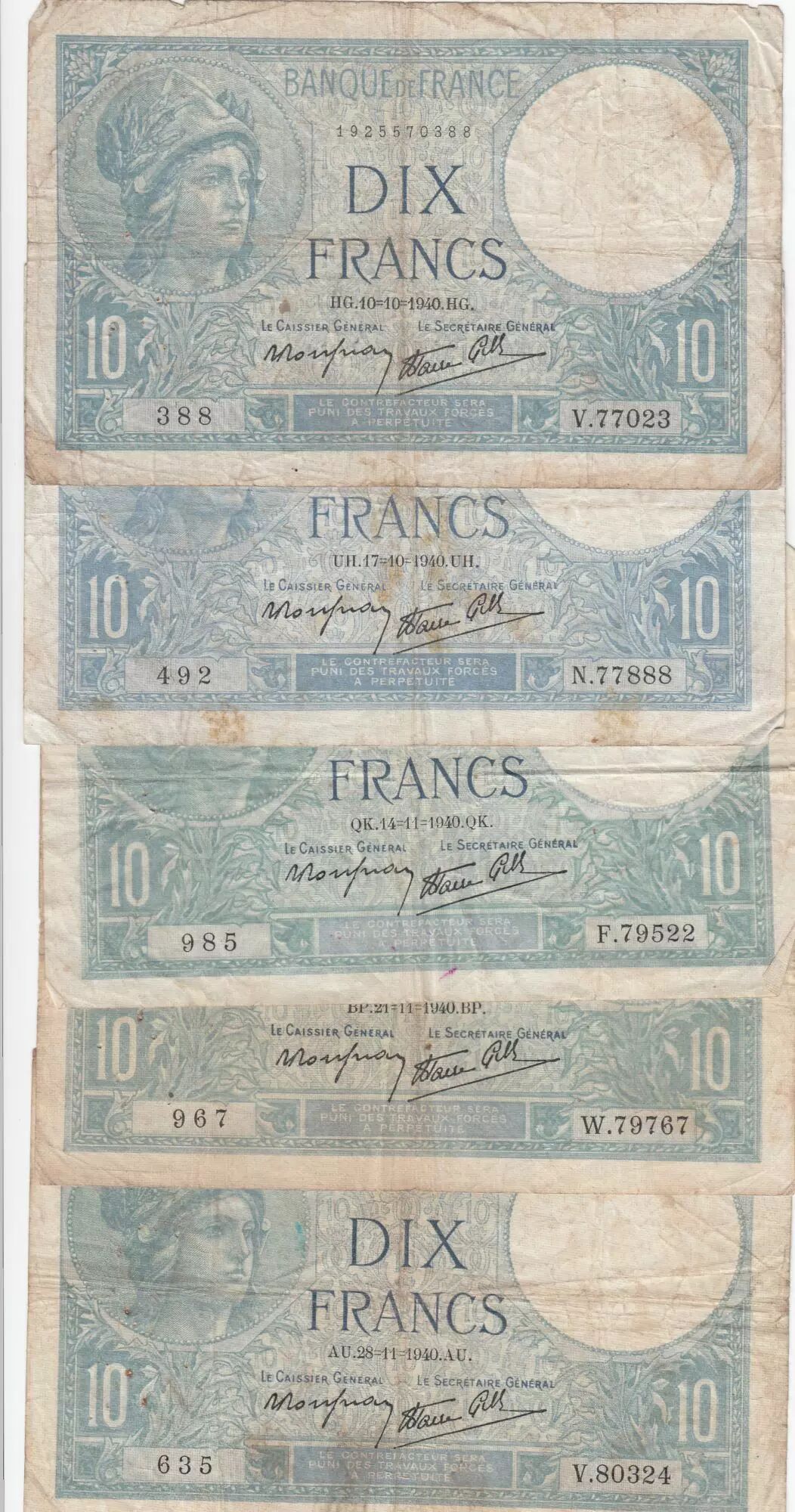 folds, stains, pinholes, poor condition but without missing part, lot of 5 notes year 1940
